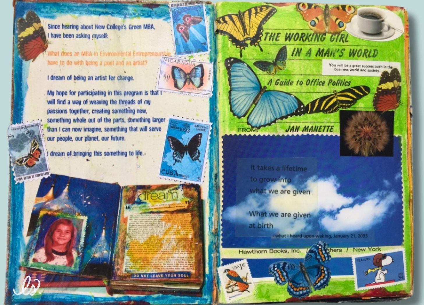 When I went to business school — as an artist, LOL— my visual journal was an altered book made from the 1960s title: The Working Girl in a Man’s World.